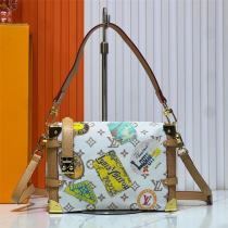 LOUIS VUITTON ユニークなショルダーバッグで、ホワイトのキャンバス地にカラフルなステッカー風のデザインが施され、遊び心あふれる印象を与えます。金具部分はゴールドで、バッグ全体に上品な輝きを加えています。肩掛けと手持ちが可能なストラップ付きで、スタイルに合わせて使い分けられるのが魅力。ルイヴィトン ショルダーバッグ
